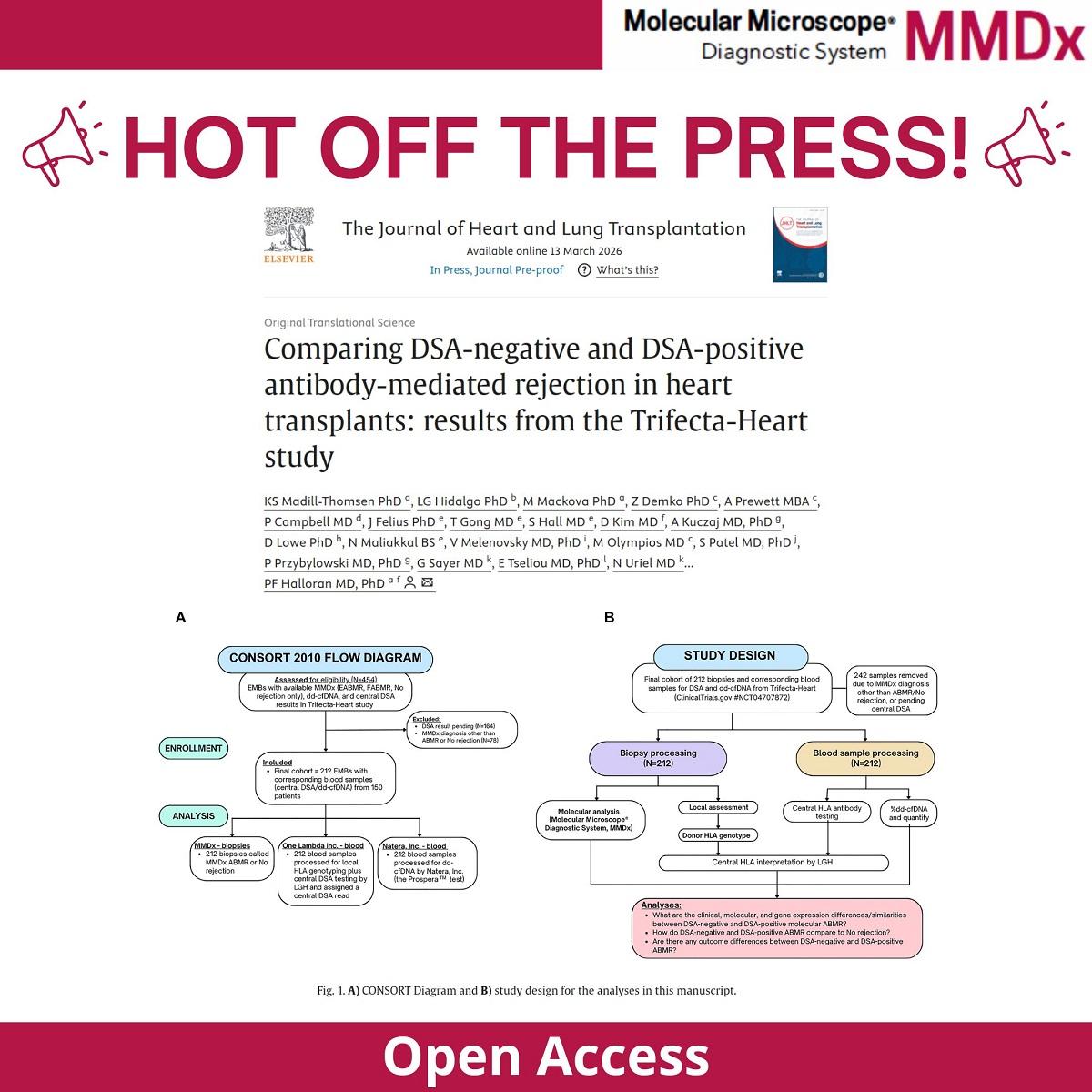 Calibrating circulating donor-derived cell-free DNA against molecular biopsy assessments.Investigators: Philip F Halloran, Jeff Reeve, Soroush Shojai, Sita Gourishankar, and the MMDx-Kidney Study Group (ClinicalTrials.gov NCT04239703) Biopsies both for indications and by protocol play an important role in managing organ transplants, but histology assessment has high interobserver disagreement (“noise”) and cannot assess recent tissue injury.To improve precision and accuracy of biopsy assessment, the Alberta Transplant Applied Genomics Centre of the University of Alberta ATAGC) has developed a new biopsy assessment system: the Molecular Microscope® Diagnostic System (MMDx), which measures global gene expression in the biopsy and uses ensembles of machine learning derived algorithms to diagnose rejection and injury. However, the decision to biopsy is often difficult for the clinician, and new tools for predicting abnormalities in the organ transplant are needed. A new blood-based test may guide decisions to biopsy: donor-derived cell-free DNA (DD-cfDNA). The donor kidney cells release DD-cfDNA during rejection and injury episodes. The Natera DD-cfDNA test is based on massively multiplexed PCR that targets 13,392 single nucleotide polymorphisms. Targeted sequences are then quantified by Next Generation Sequencing (mmPCR-NGS). The ATAGC cfDNA-MMDx study (“Trifecta”) will compare DD-cfDNA, DSA, and MMDx results in prospectively collected clinically indicated kidney transplant biopsies and accompanying blood samples from participating American and European centers. DD-cfDNA (Prospera® test; Natera Inc.) levels will be calibrated against the MMDx biopsy diagnoses of T cell-mediated rejection (TCMR), antibody-mediated rejection (ABMR, and its stages), and acute and chronic injury. The Trifecta study also includes donor-specific antibody (DSA) assessment by One Lambda. The DD-cfDNA will be calibrated for its ability to predict the MMDx phenotypes in the biopsy. The major trial objectives are 1.) to calibrate DD-cfDNA readings against the MMDx assessments of TCMR, ABMR, and injury; 2.) to optimize and quantify donor DNA measurements; 3.) to develop new treatment algorithms that incorporate both rejection mechanisms is kidney and release of donor DNA. We believe that calibrating the Prospera® DD-cfDNA test and One Lambda HLA typing results against MMDx will improve transplant patient care but also generate novel insights into clinical scenarios. In addition, DD-cfDNA testing plus MMDx may reduce unnecessary indication biopsies, and make the biopsies that are performed much more useful, and the management decisions more effective. More accurate diagnoses will lead to increasingly personalized treatment, superior endpoints for clinical trials of new agents, and prolonged graft survival.